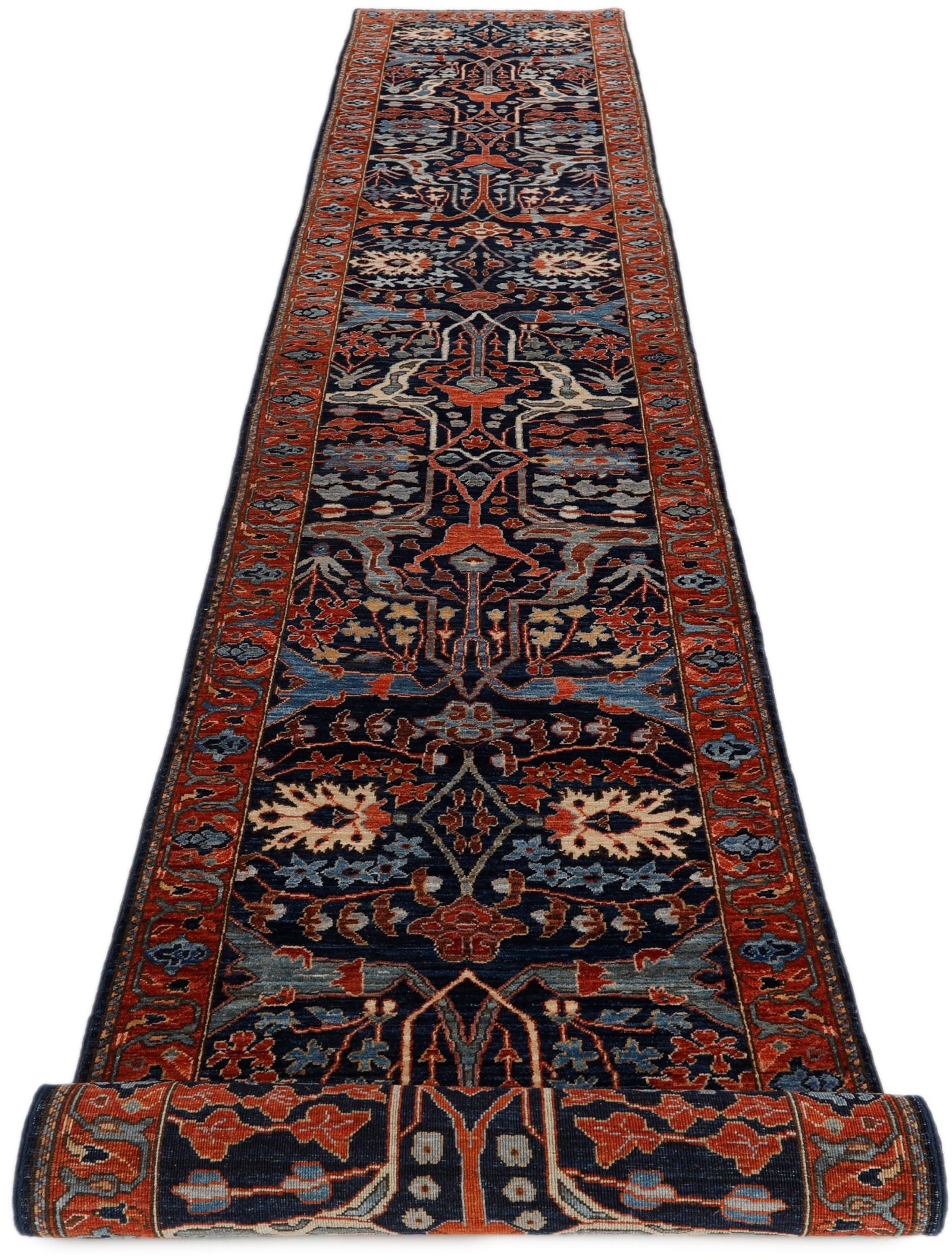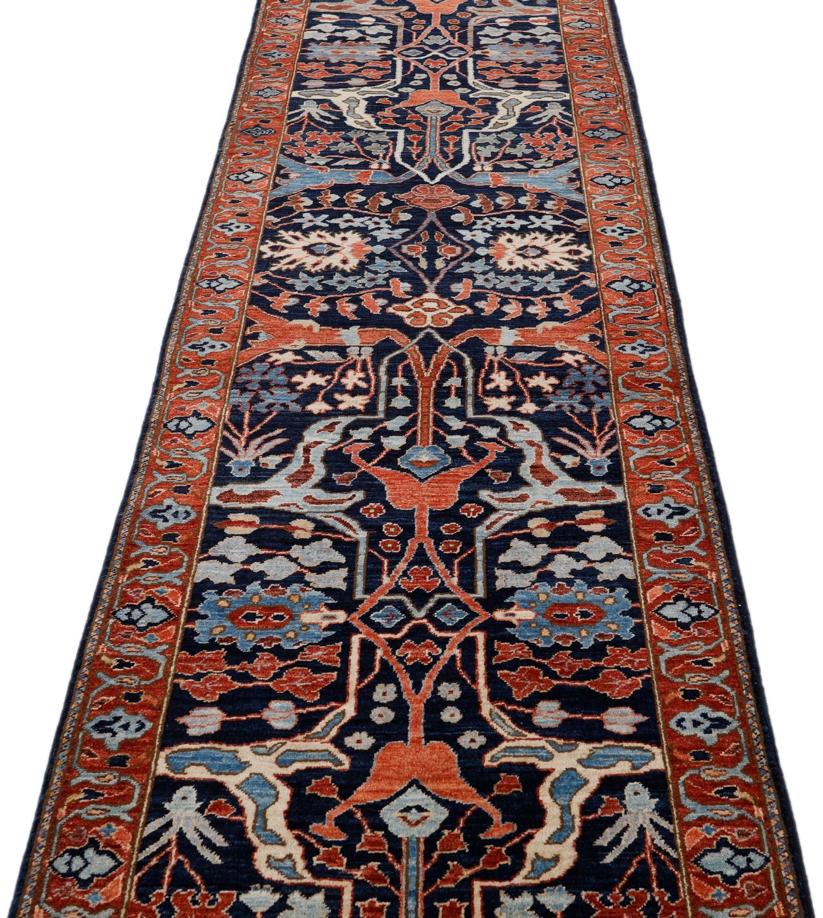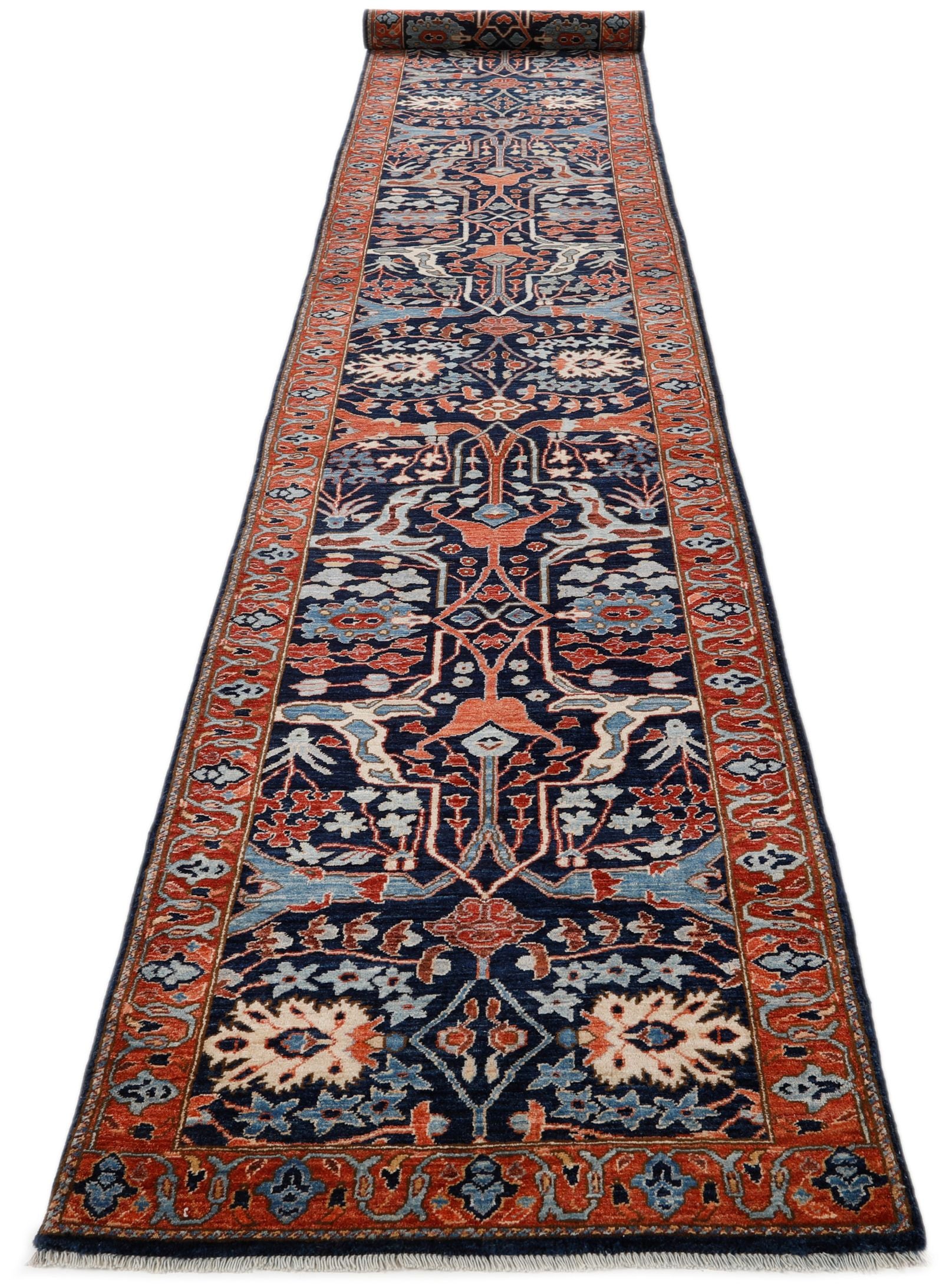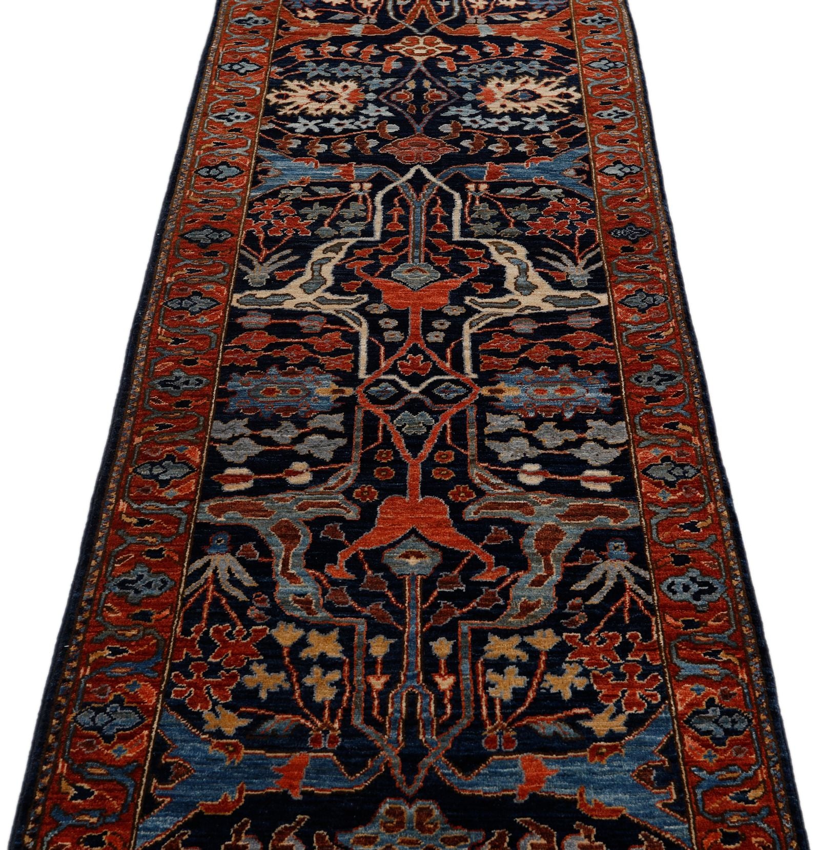 3x17 Navy and Rust Traditional Runner Handknotted Wool Vintage Design Turkish Rug Handmade Distressed Traditional, Floral Runner