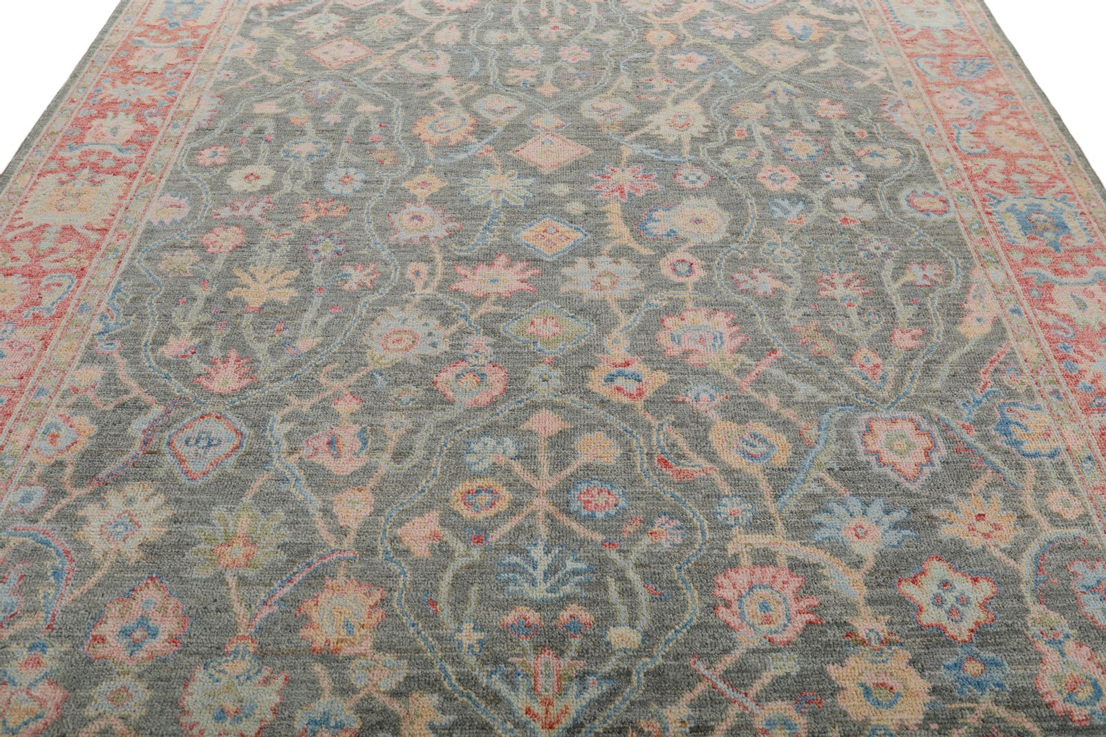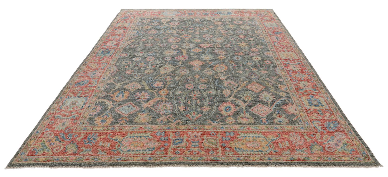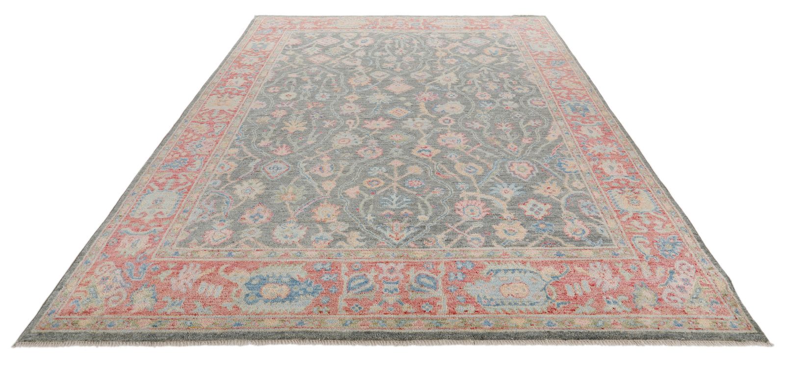 8x10 Gray and Red Turkish Oushak Rug Handknotted Wool Vintage Design Turkish Rug Handmade Distressed Traditional, Floral Rug