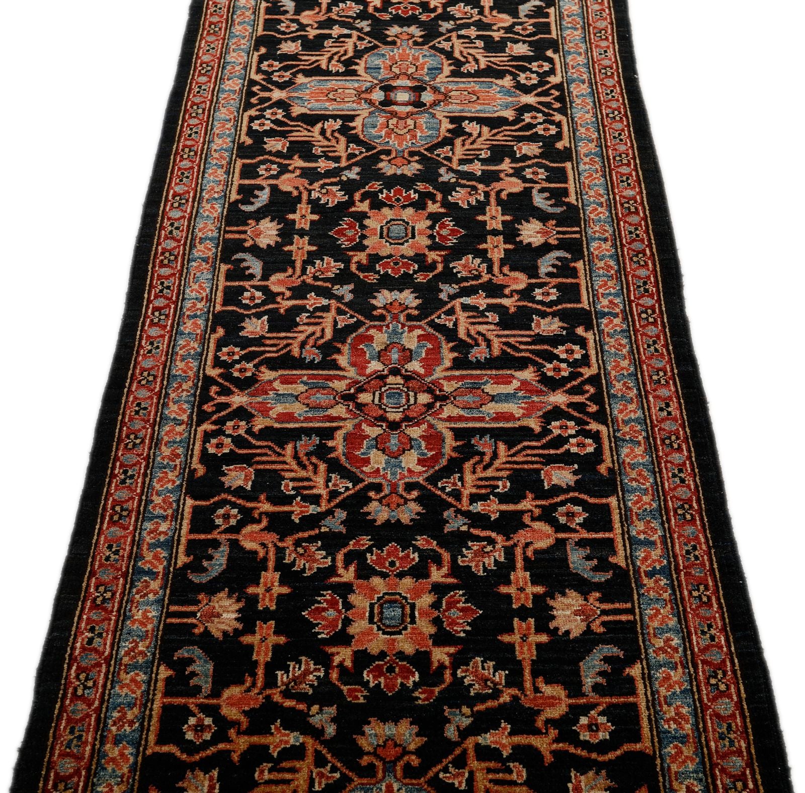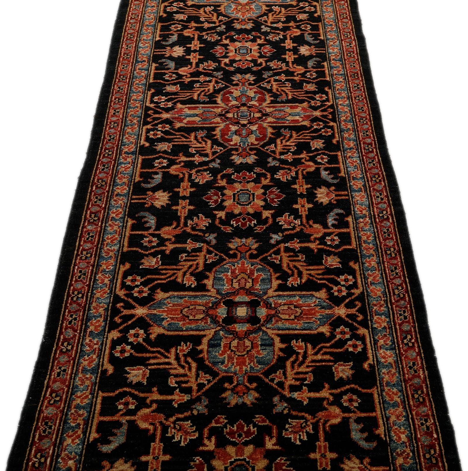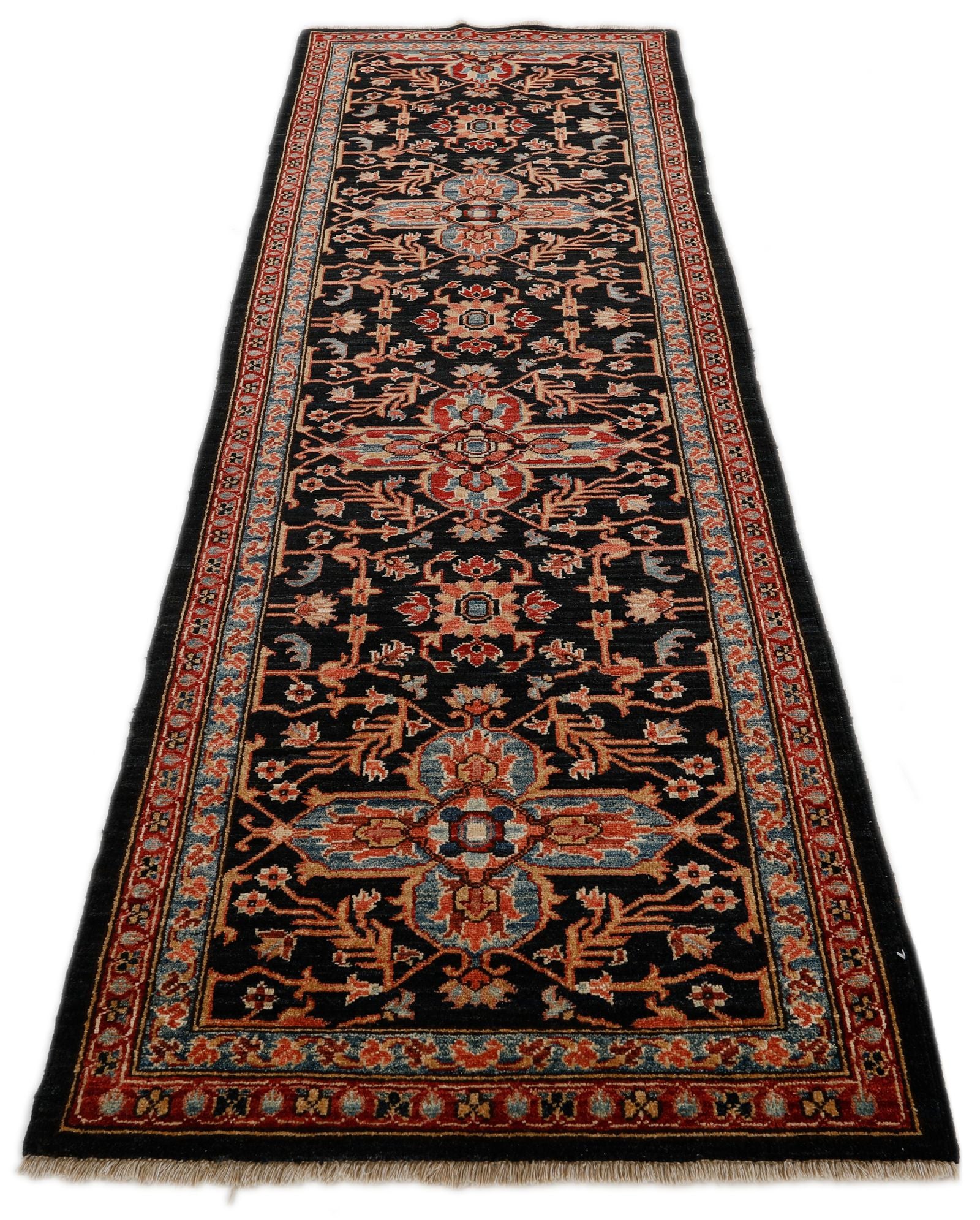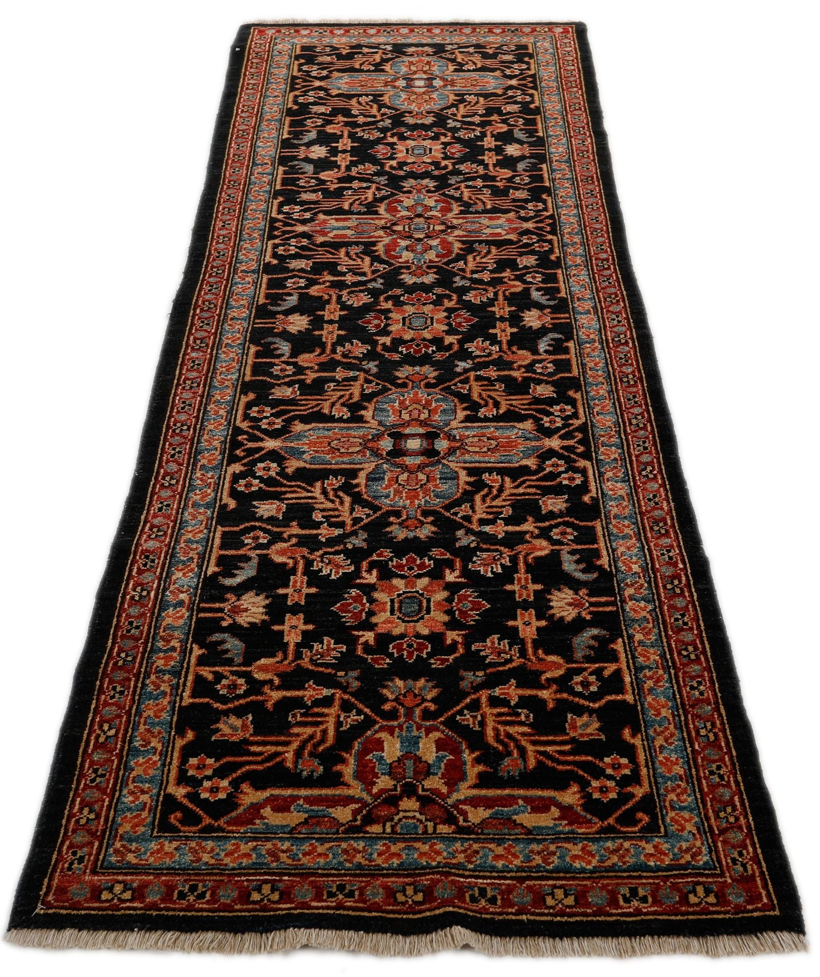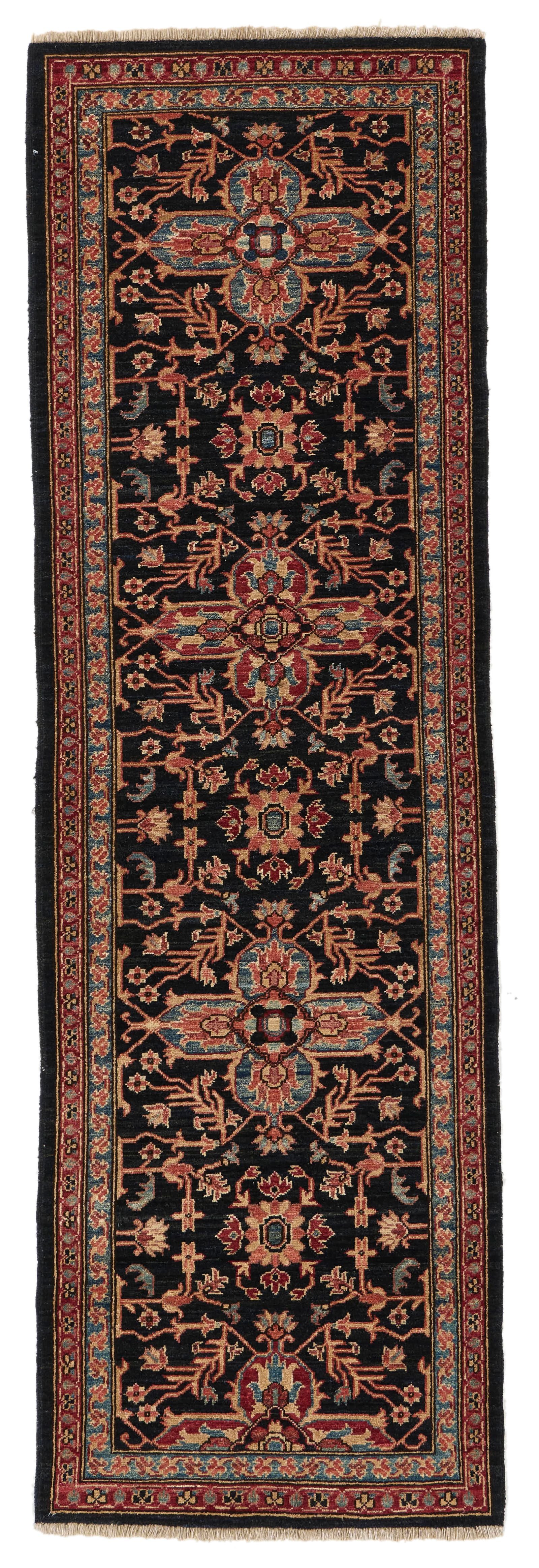 3x8 Navy and Multicolor Anatolian Traditional Runner Handknotted Wool Vintage Design Turkish Rug Handmade Distressed Tribal, Floral Runner