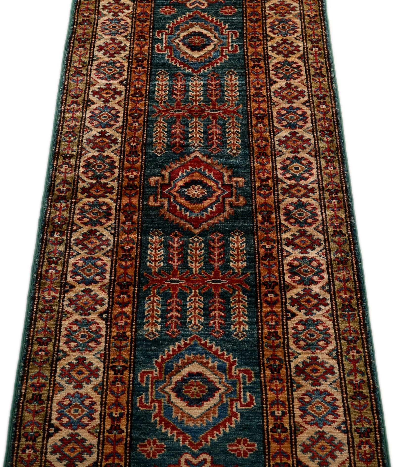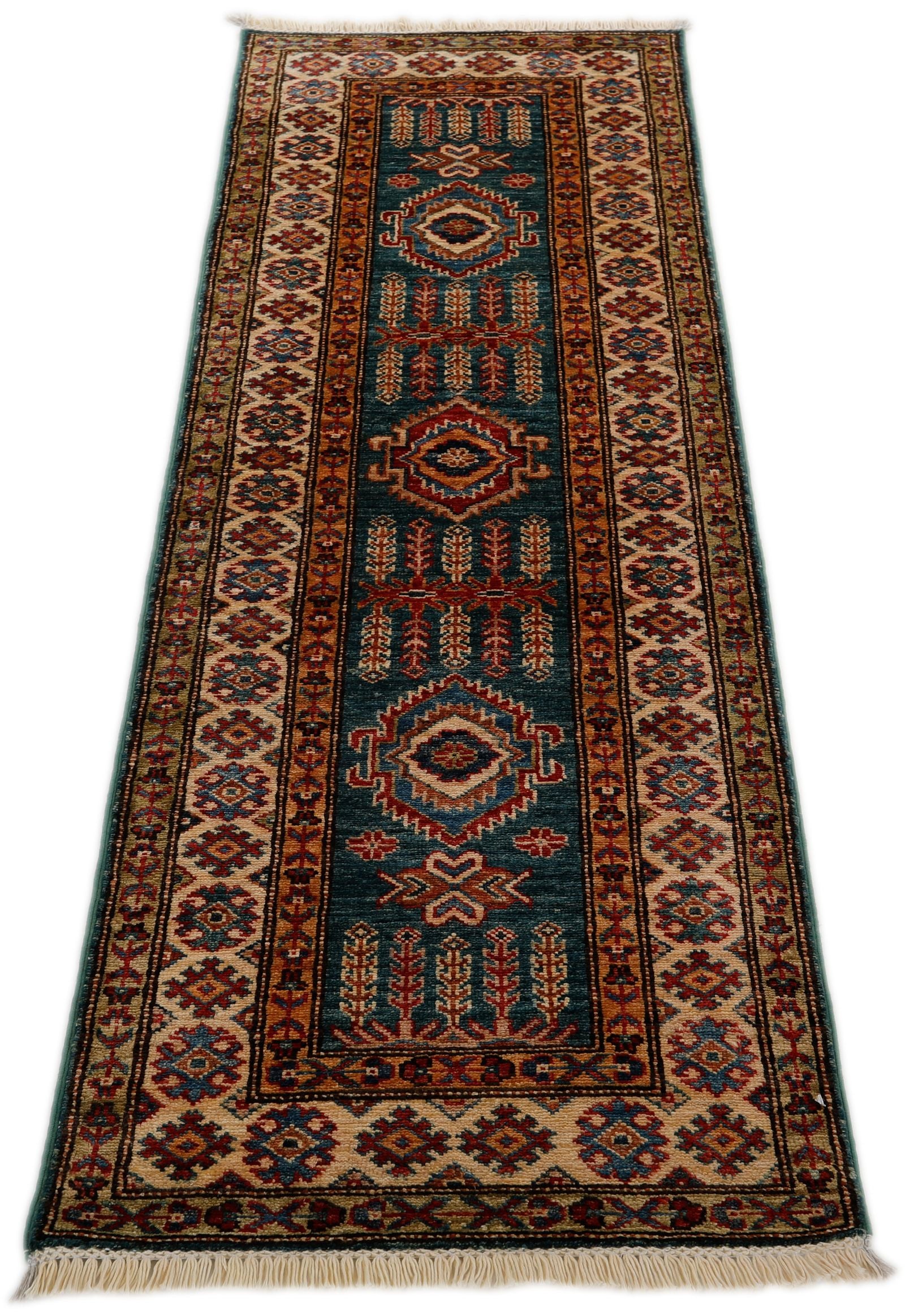 2x6 Green and Blue Kazak Tribal Runner Handknotted Wool Vintage Design Turkish Rug Handmade Distressed Tribal, Floral Runner