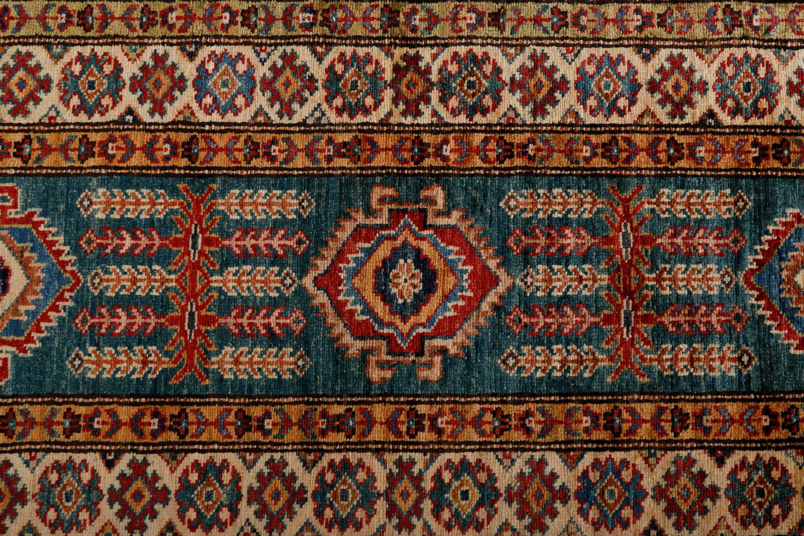 Name: Vintage Handmade 2x6 Green and Blue Caucasian Hand Knotted Tribal Kazak Runner