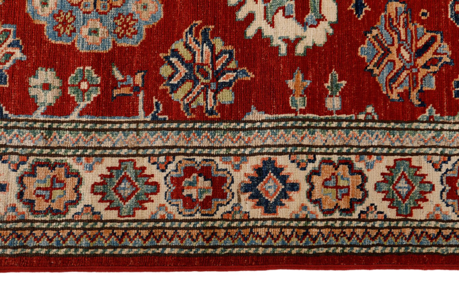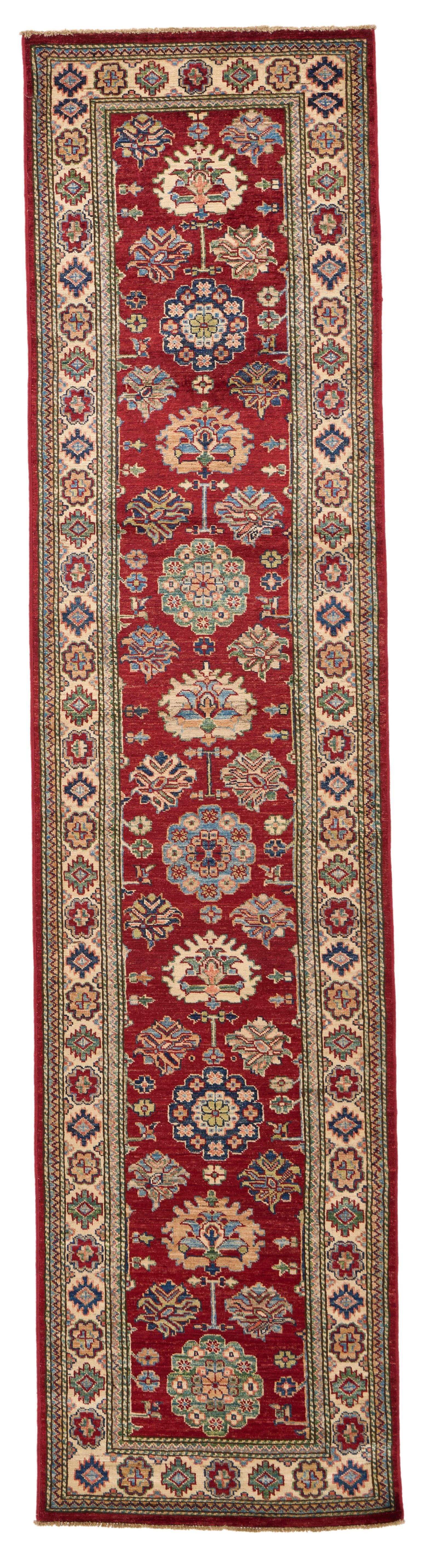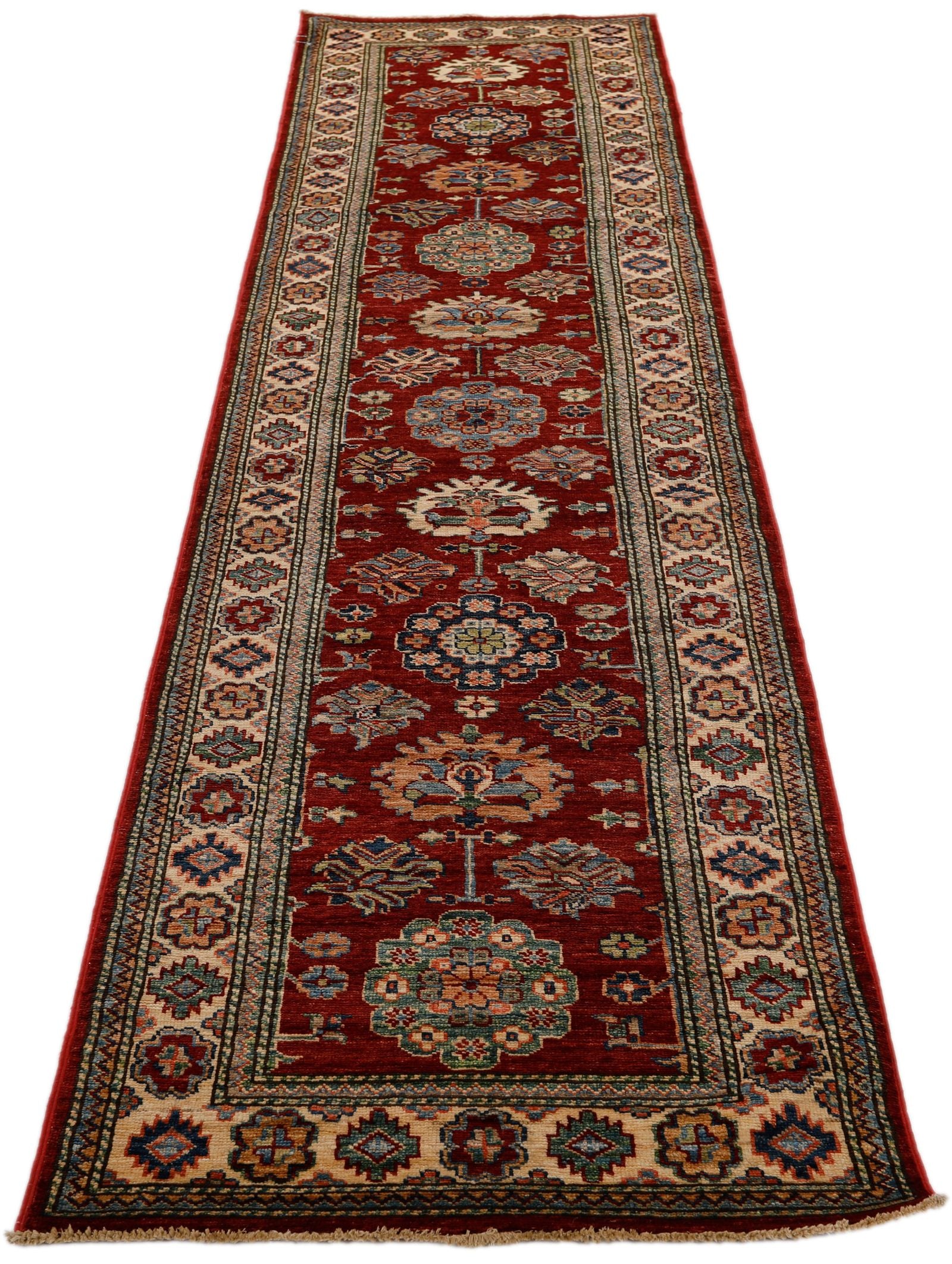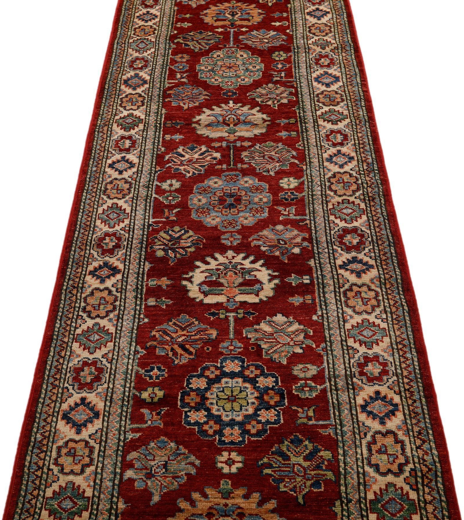 2x10 Red and Ivory Kazak Tribal Runner Handknotted Wool Vintage Design Turkish Rug Handmade Distressed Tribal, Floral Runner