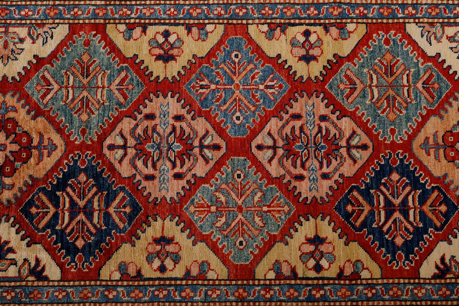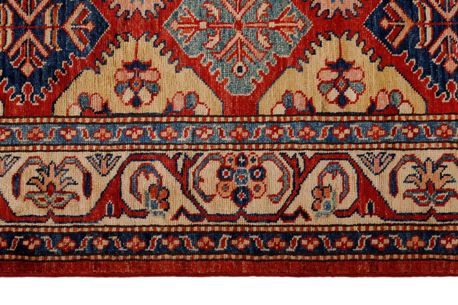Kazak rugs are known for their bold, geometric designs and rich history. These handmade rugs were woven by the nomadic tribes of the Caucasus region, which includes modern-day Armenia, Azerbaijan, and Georgia. The Kazaks are the largest tribal group in this region and have been weaving rugs for centuries. Vintage Kazak rugs are made with high-quality wool and feature vivid colors, including reds, blues, and greens. The designs often include large medallions, diamonds, and other geometric shapes. The name "Kazak" comes from the word Cossack, as these rugs were often traded by the Cossacks who lived in the area. Today, antique Kazak rugs are highly sought after by collectors and interior designers alike for their beauty, sustainability and history.