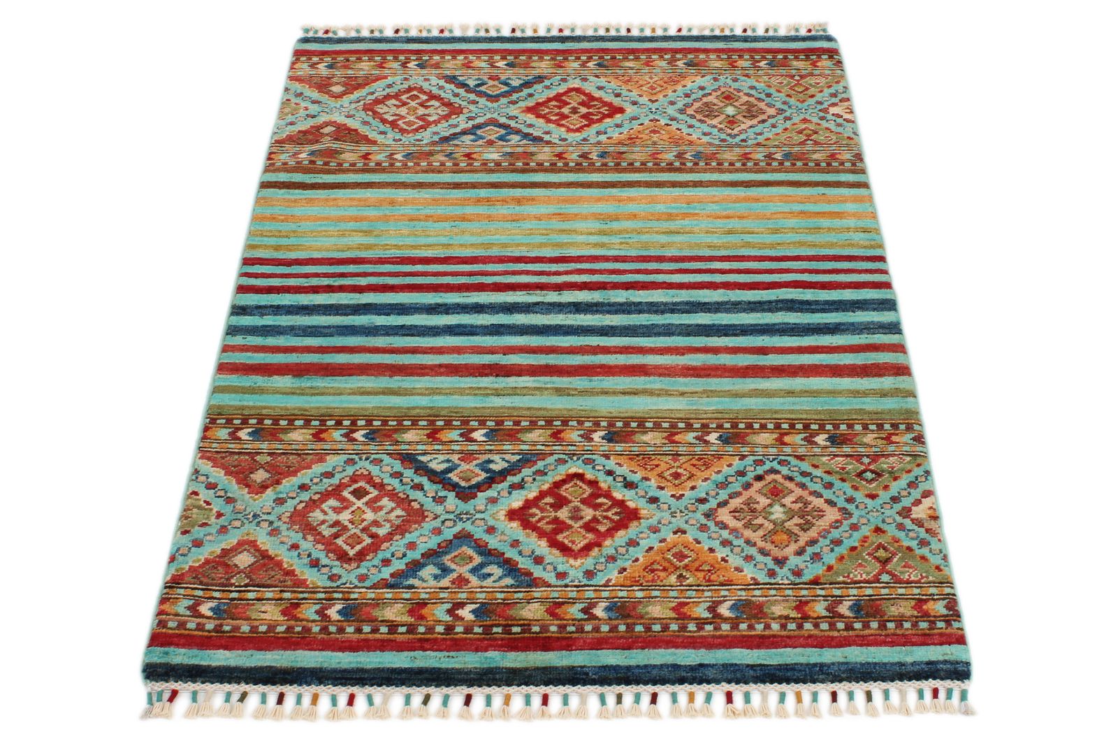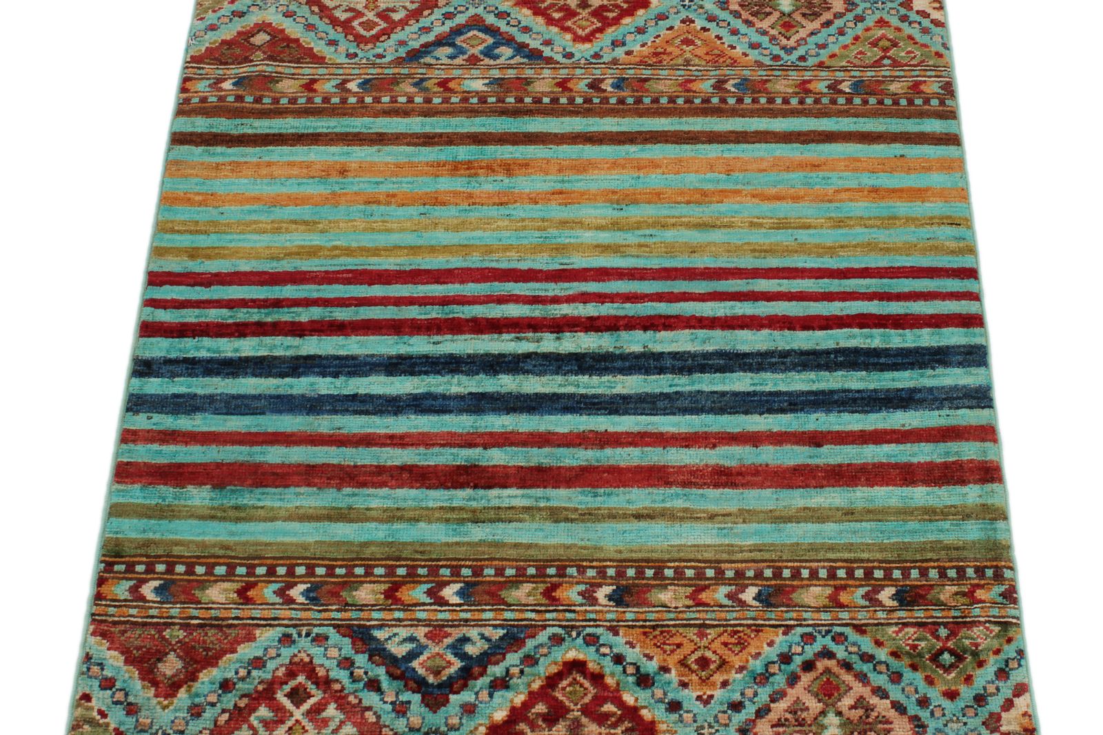 3x4 Turquoıse and Multicolor Tribal Rug Handknotted Wool Vintage Design Turkish Rug Handmade Distressed Tribal, Floral Rug