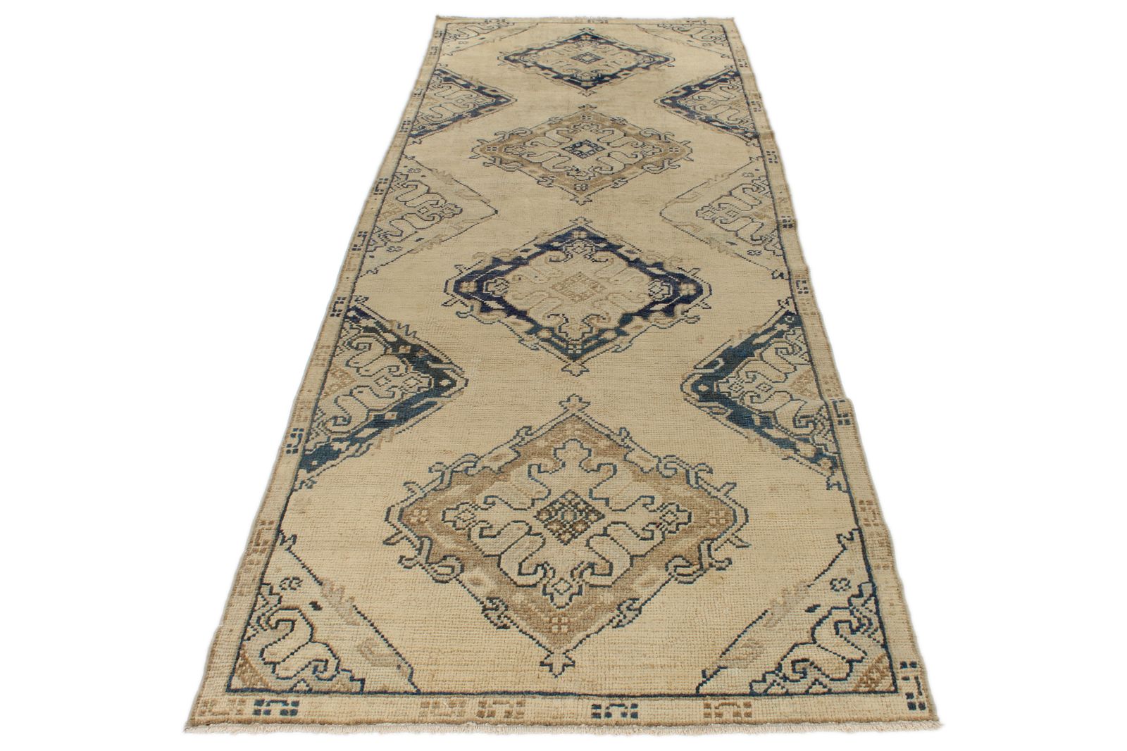 Name: Vintage Handmade 4x11 Ivory and Blue Anatolian Tribal Runner