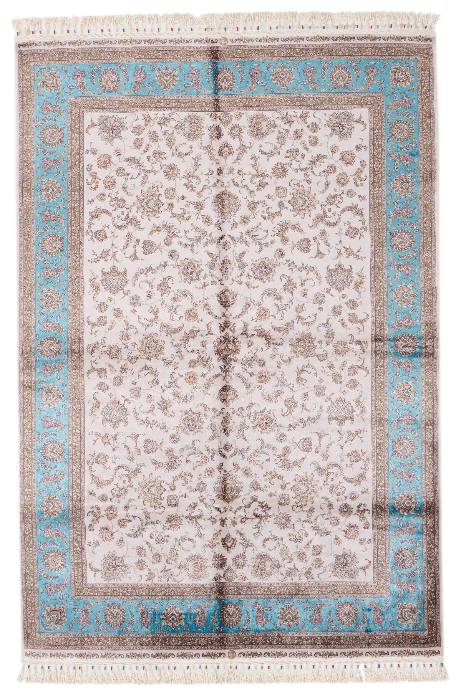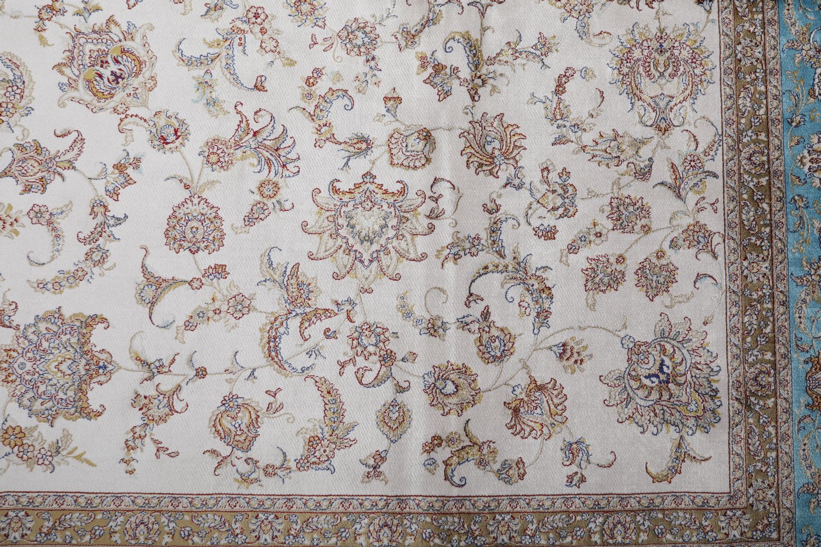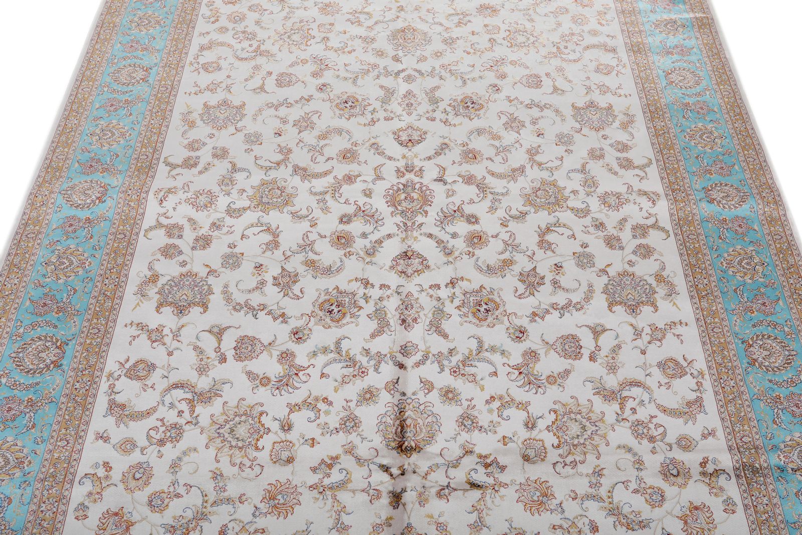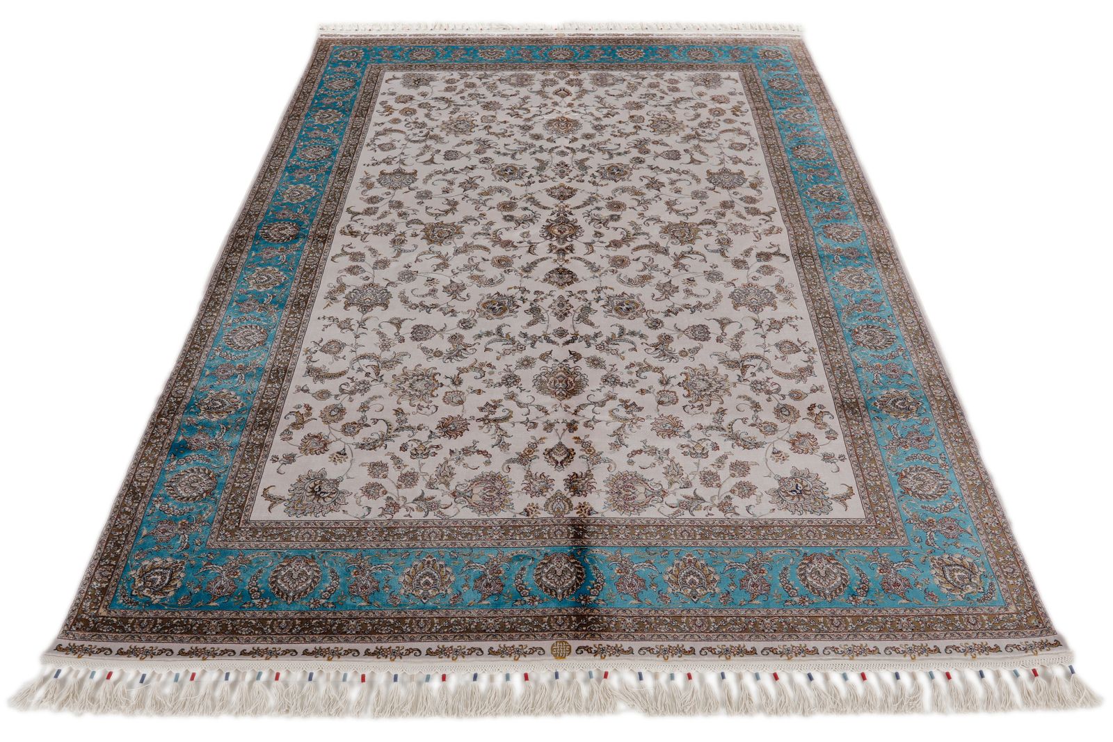 5x8 Ivory and Blue Turkish Antep Handknotted Wool Vintage Design Turkish Rug Handmade Distressed Silk, Floral Runner
